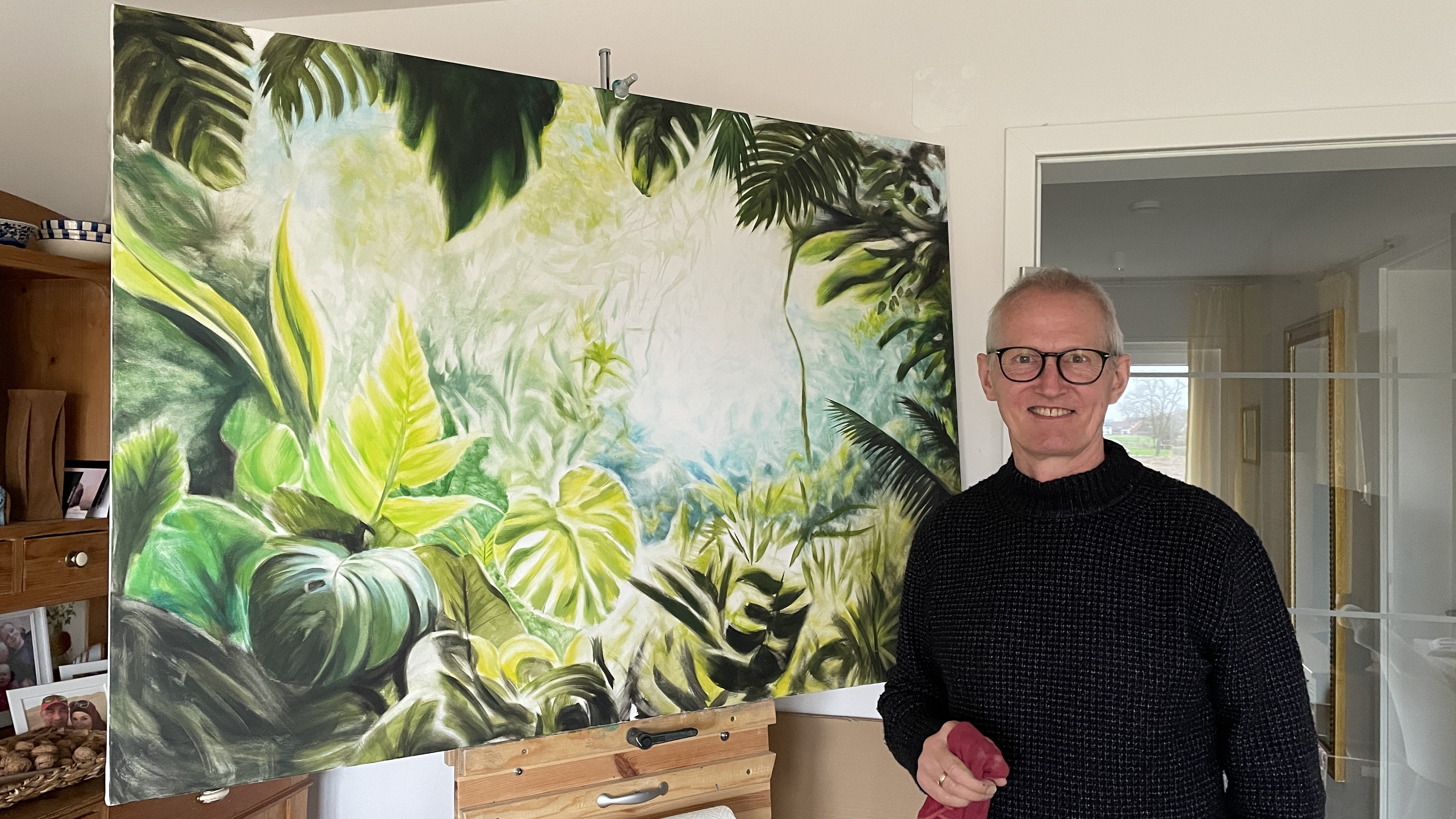 Am gleichen Abend noch, griff ich zu Bleistift und Papier und malte ein drappiertes Tuch, so wie es im Buch beschrieben war. Ich zeigte es meiner Familie und zu meinem Erstaunen waren alle begeistert. Mein Sohn sagte zu mir: "Dann kannst du ja jetzt die Bilder für meinen Kunstunterricht malen." Derart motiviert malte ich alle Bilder aus dem Buch. Auf dem Bleistift folgte die Kohle und bald wurde es bunt, sehr bunt. Auf Hartfaserplatten vom Sperrmüll quälte ich unzählige Pinsel und füllte sämtliche Wände im Treppenhaus.